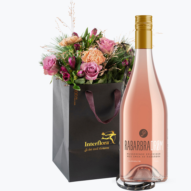 Nydelig frodig bukett med ulike blomster i delikate lilla/fersken nyanser med blant annet roser , alstromeria florlette strå og vakkert grønt. Din blomsterhilsen leveres på døren i vår eksklusive gavepose sammen med en flaske alkoholfri sprudlende Cider med smak av rabarbra og vil garantert glede den heldige mottakeren.